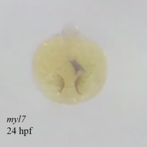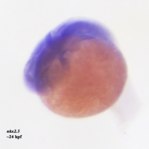Shown here is the expression of nkx2.5 within a developing zebrafish heart at ~ 24 hpf. This gene is highly conserved and functions as a major transcriptional regulator of cardiac morphogenesis.