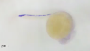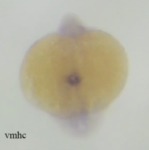 We have been busy this summer optimizing protocols. Shown below are images of fixed embryos between 20-24 hours post fertilization. The purple stain indicates specific locations of gene expression for gata1 (erythroid specific transcription factor) and vmhc (ventricular myosin heavy chain).
